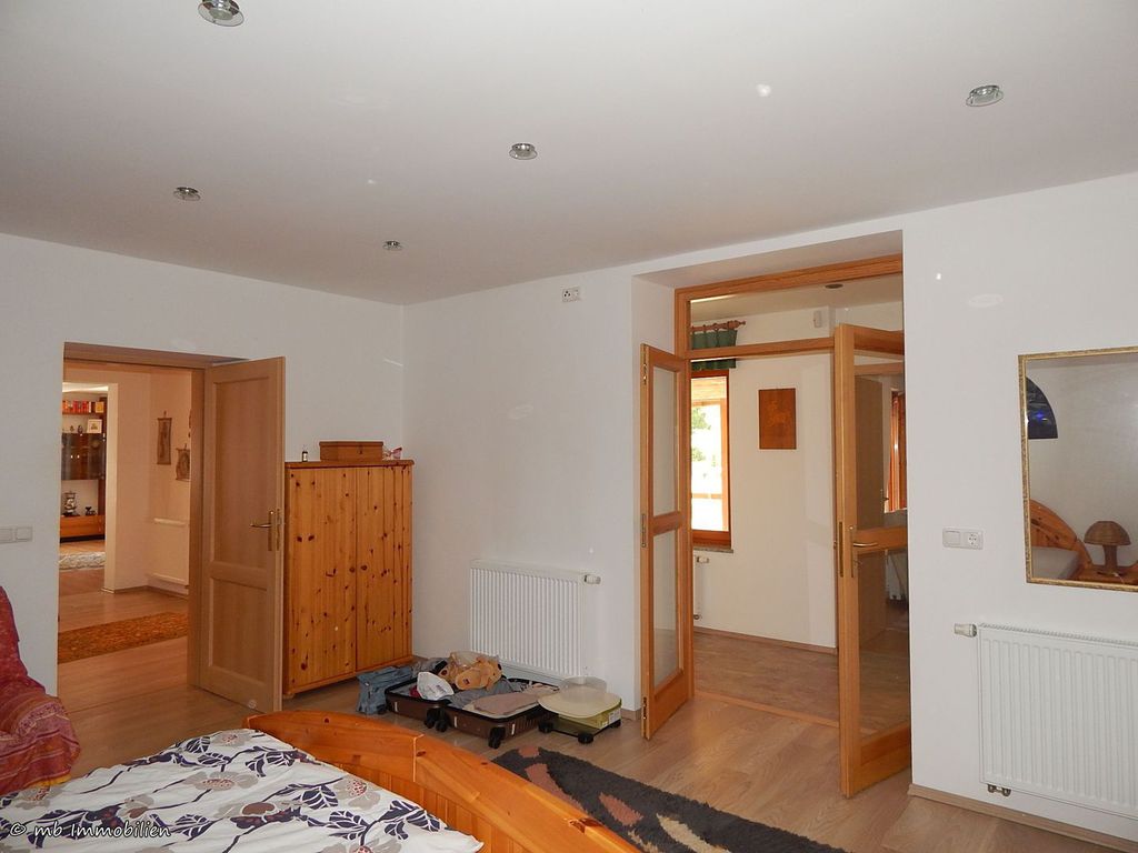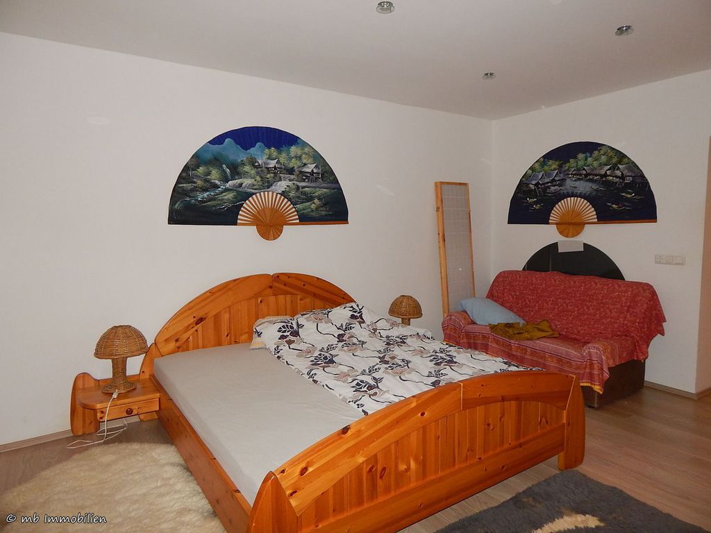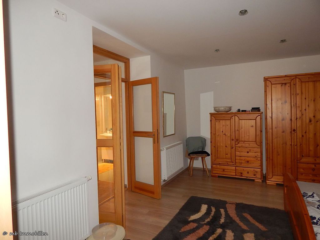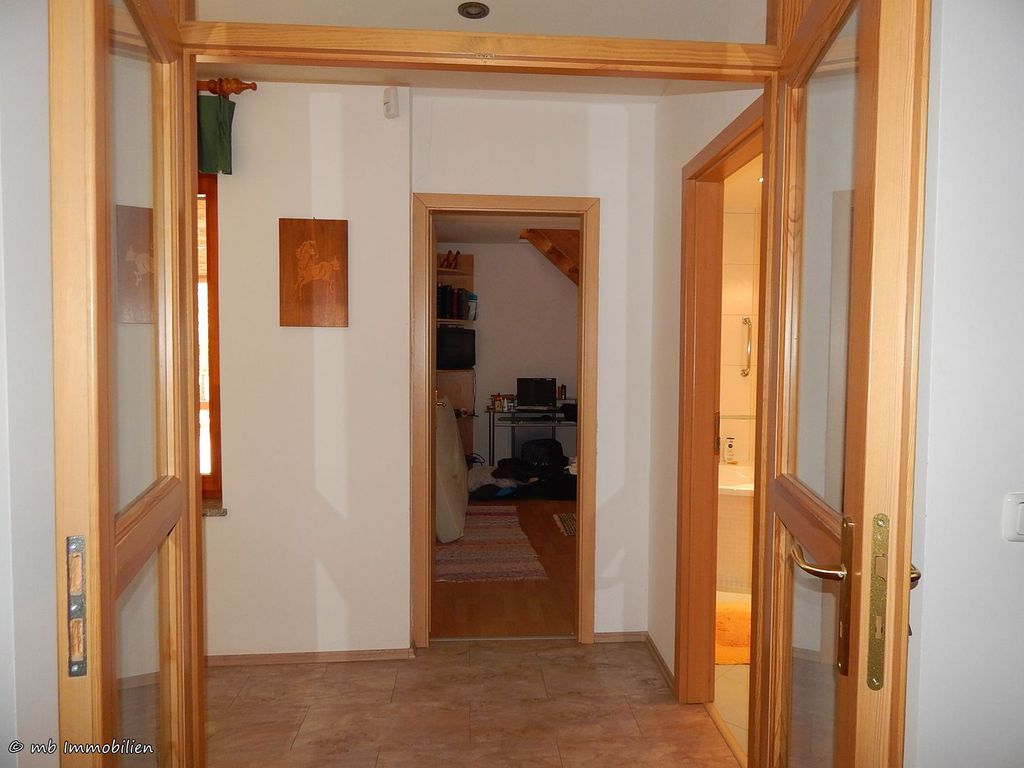 Über eine massive Holztreppe gelangt man ins Dachgeschoss, das teilweise ausgebaut wurde und aktuell ein weiteres Schlafzimmer beherbergt. Dieser Raum strahlt mit seinen Holzelementen und den gemütlichen Dachschrägen ein besonderes Flair aus – ideal als ruhiger Rückzugsort für Gäste.